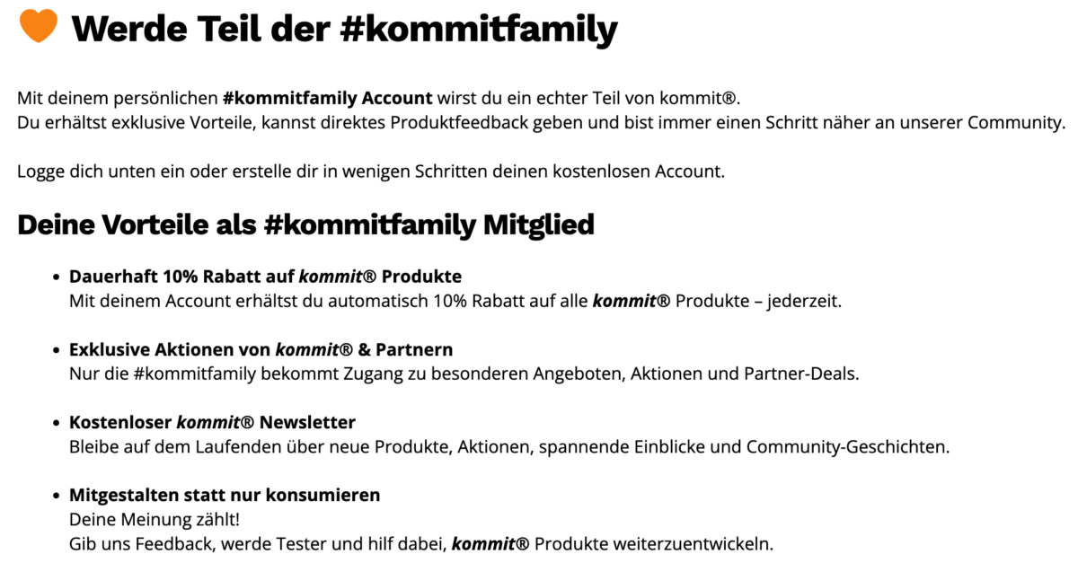 Dauerhaft 10% Rabatt auf kommit® Produkte, besondere Aktionen mit kommit® & Partnern, Einladungen zu Community-Aktionen und die Möglichkeit, Feedback zu geben und Produkte aktiv mitzugestalten